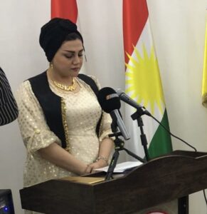 المشرفة على فقرات الحفل الاستاذة هديل صالح/ مسؤول الثقافة والإعلام للفرع الخامس، طلبت من الحضور الاستماع وقوفا للنشيد الوطني العراقي والنشيد الوطني الكوردستاني (اي رقيب)، ثم قرأت برقيات التهنئة الواردة، أولا: برقية سيادة نائب رئيس مجلس النواب، الذي ثمن دور الصحافة الكوردستانية في تعزيز الوعي وبناء المجتمع.